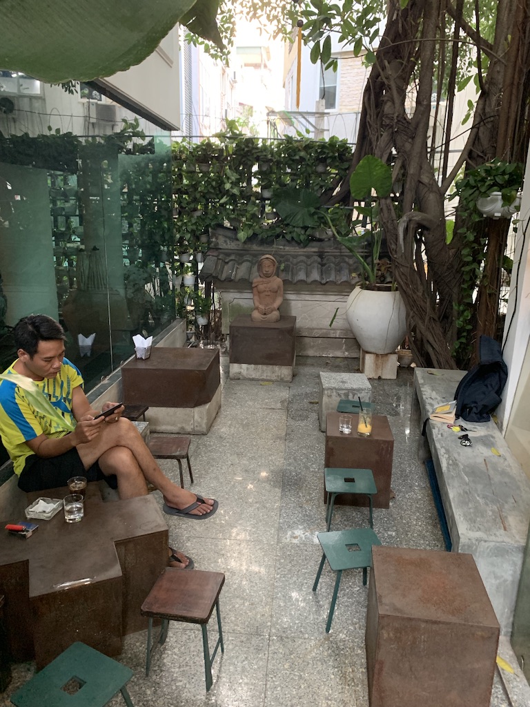 Hanoi is a ridiculously rich café culture, with all kinds of establishments, bare bones to socialistic hip, selling caffeinated beans. I dropped Mo off at music class off of any alleyway that could only fit on motorbike at a time. I wasn’t expecting to find a suitable place to while away the music class, but surprisingly–then again, not surprisingly in Hanoi, I found this gem of an oasis confined to the smallest of spaces. The owners crammed it in between banyan trees multiple stories high, along with a plethora of other potted plants and even fish tanks on ledges. The aesthetic was minimalist and modern, with only little stools as seating.