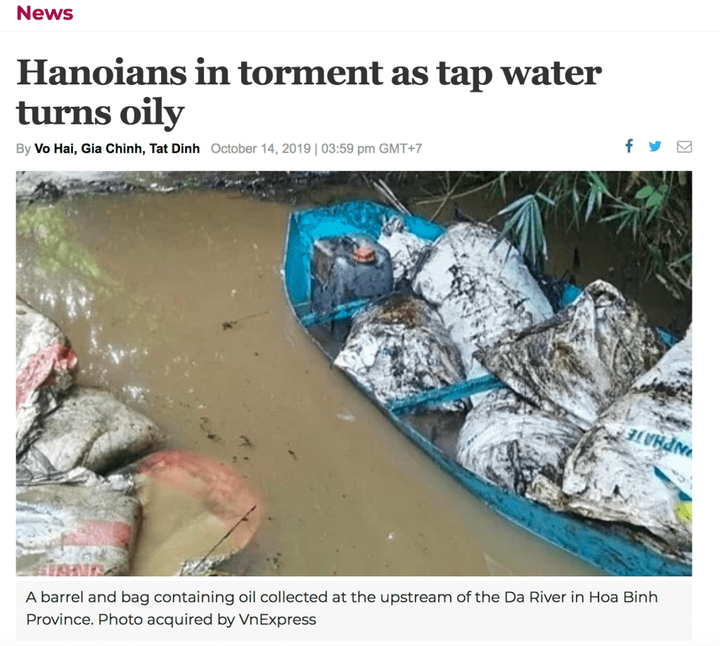 Water: On October 8th, a tanker dumped oil into the Red River, contaminating the water supply of many residents in Hanoi with styrene and other contaminants. Rumors abound about what happened and why. It took days for the water to be declared unsafe, even after residents complained about the blackish color and the stench. The company knew about the contamination, but did not take action. Our area was unaffected
