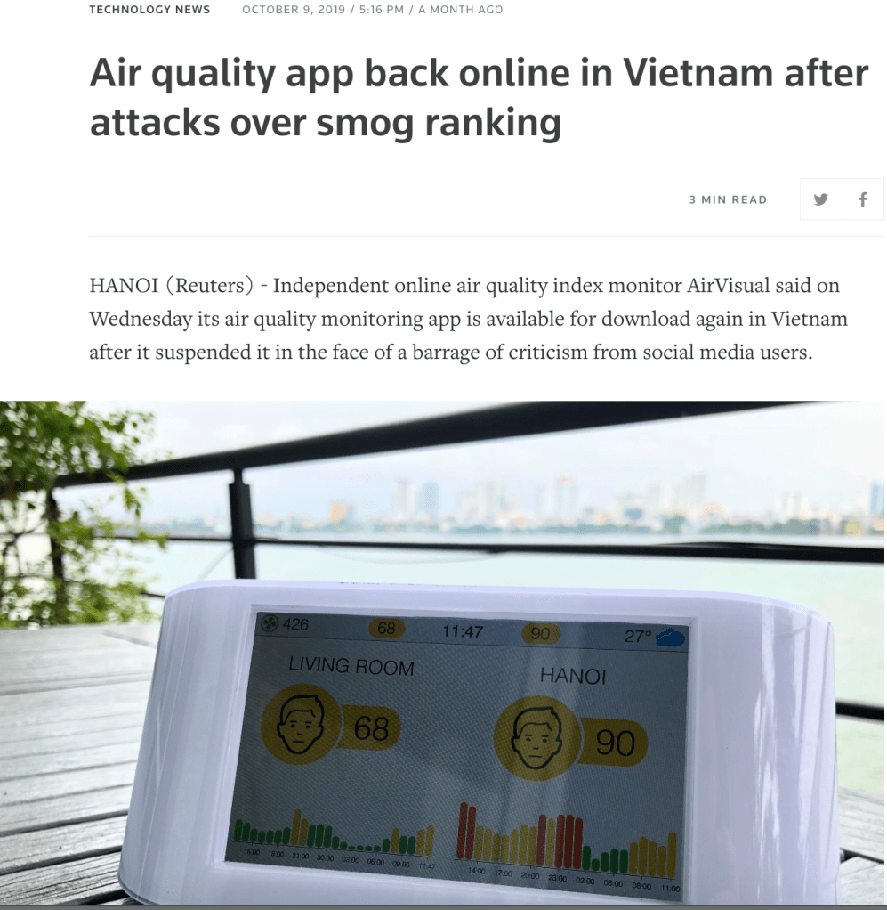 Meanwhile, the government and outraged bloggers spent time disputing whether IQ AIR’s website accurately listed Hanoi as the worst air (instead of the 2nd worst). Reuters reported that “the criticism of AirVisual snowballed after Vietnamese Facebook user Vu Khac Ngoc, an online chemistry teacher with almost 350,000 followers on the site, said in a post that AirVisual was manipulating its data to sell air purifiers made by its parent company, IQair.”